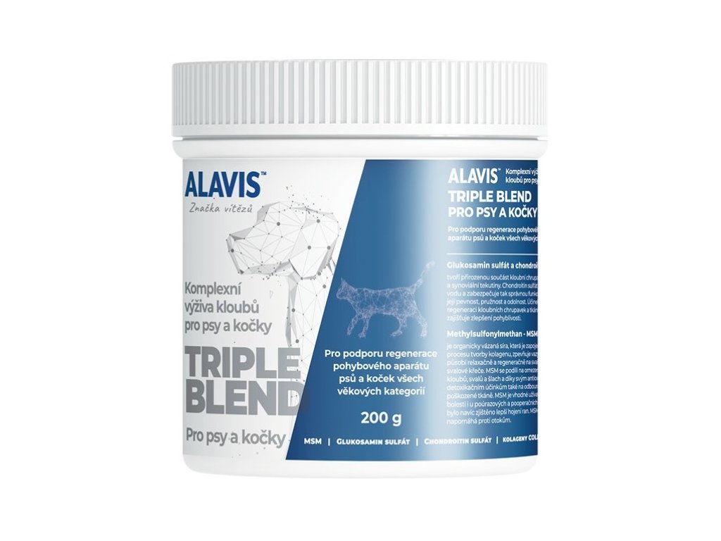 ALAVIS™ Triple Blend pre psov a mačky 200 g pomáha zmierniť bolesti pohybového aparátu a zlepšiť pohyblivosť a fyzickú výkonnosť, spomaľuje, až zastavuje ďalšie poškodzovanie kĺbových chrupaviek.