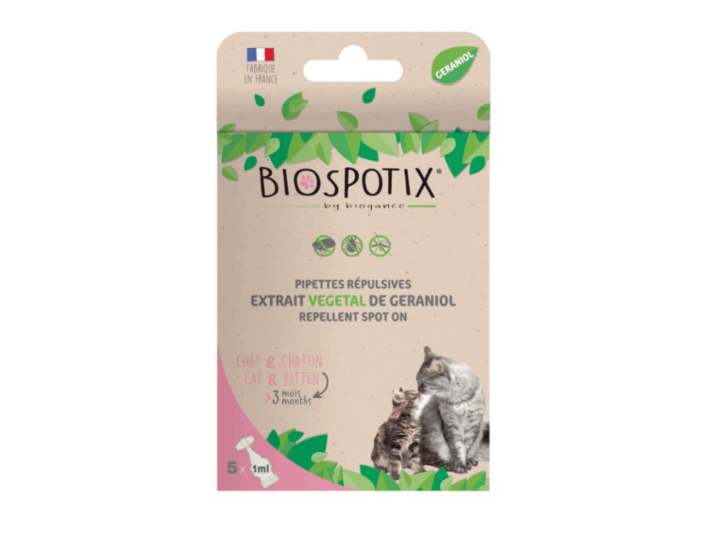 Biospotix je 100% prírodný s použitím esenciálnych olejov geraniolu. Každá škatuľka obsahuje 5 pipiet po 1 ml. Každá pipeta vydrží 4 týždne a poskytuje ochranu na 5 mesiacov.