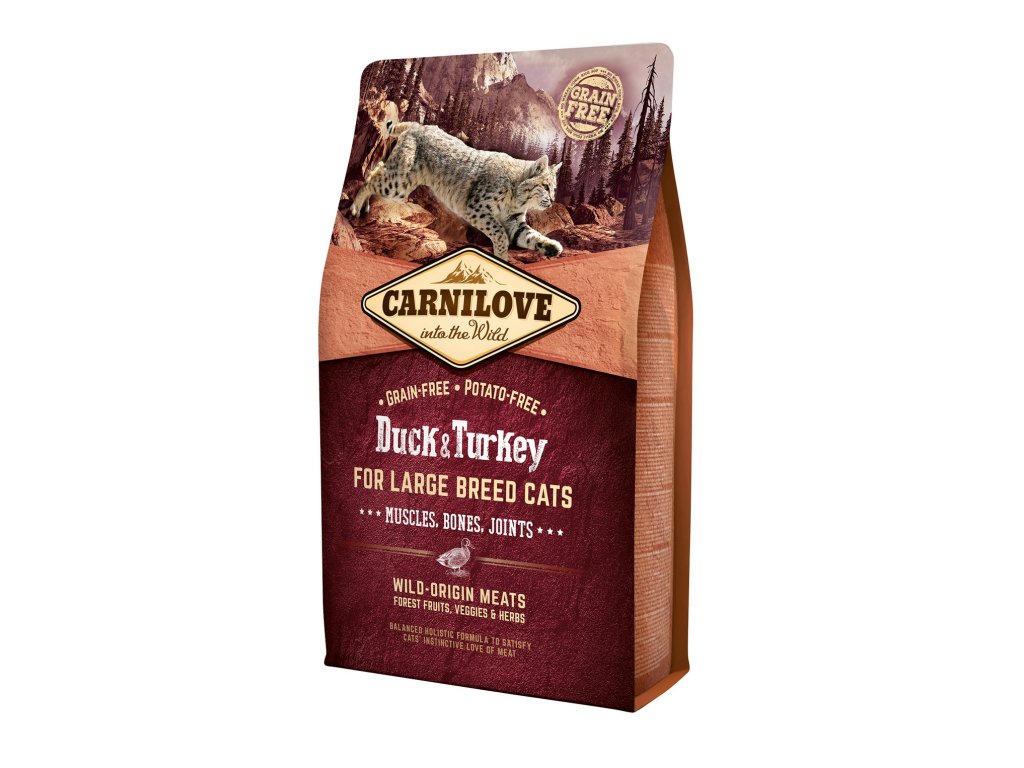 Carnilove Cat Grain Free Duck & Turkey je vysoko kvalitné holistické krmivo, ktoré je tvorené kombináciou morčacieho a kačacieho mäsa pre perfektnú kvalitu kostí, svalov a kĺbov veľkých plemien mačiek. Moriak a kačica majú vysoký podiel stráviteľných proteínov a nenasýtených tukov pre výživu svalstva a doplnenie energie. Vyššiu záťaž pohybového aparátu kompenzujú obsiahnuté chondroprotektíva a prírodné látky na podporu hybnosti kĺbov a pevnosti šliach a väzov. Krmivo obsahuje mäso divokého pôvodu, lesné plody, zeleninu a bylinky. Neobsahuje obilniny ani zemiaky. Jedinečná chuť moriaka a kačice uspokojí prirodzenú mačaciu túžbu po chuti mäsa. Vyrobené v ČR.