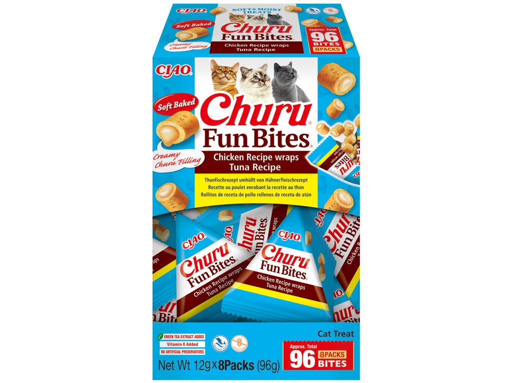 Churu Fun Bites sú mäkké, vankúšikovité maškrty s krémovou Churu tuniakovou náplňou, vyrobené z kvalitného kurčaťa, bez obilnín a umelých prísad.