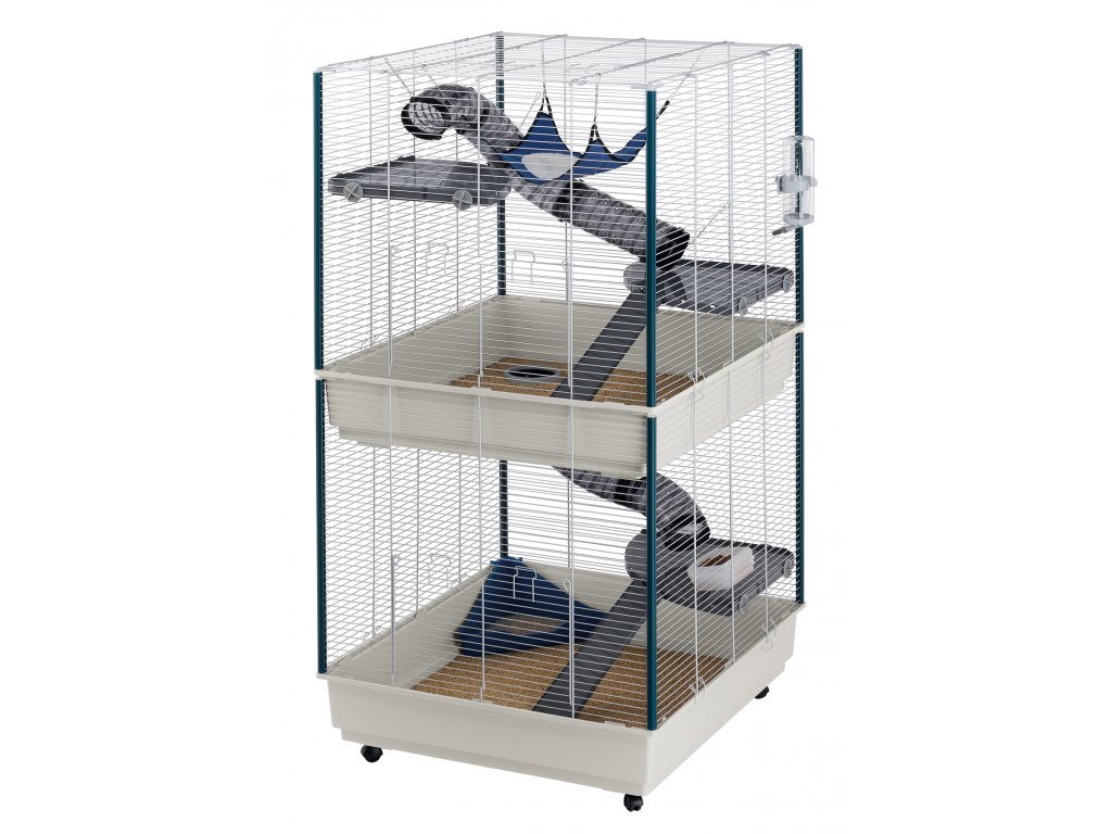 Priechodná dvojposchodová klietka pre fretky alebo potkany má bohatú výbavu. Obsahuje plastovú misku, náustok, toaletku pre hlodavce, 3 plastové medziposchodia, 2 rebríky, 2 plastové tunely a závesné odpočívadlo. Rozmery 75x80x161 cm.