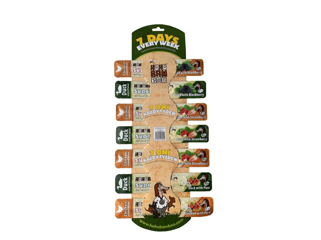 Huhubamboo SUPERSTICK 7 Days Mix je saláma z kurčaťa 64% a černice 10%. Prírodná mäsová pochúťka pre psov.