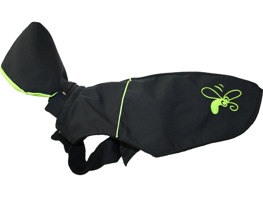 Šikovný kabátik HUHUBAMBOO s kapucňou v čiernej farbe so žltými prvkami je vhodný pre menšie plemená psov, ako dokonalá ochrana proti vetru a dažďu.