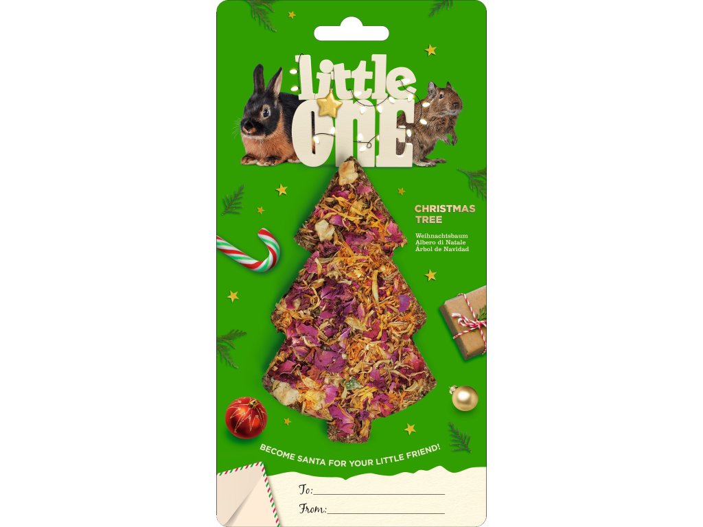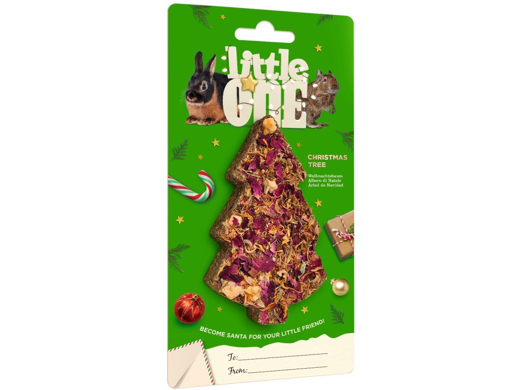 Maškrta v tvare vianočného stromčeka, ako ideálny darček pre vášho hlodavca alebo zajačika pod stromček. Maškrta je vyrobená z kvalitného sena špeciálne stlačeného do tvaru a stromčeka ozdobená farebným sušeným kvetom, ktorý sa hodí tematicky k vianočnému obdobiu. Urobte svojmu chlpáčovi chutnú a zdravú radosť s maškrtou Little One.