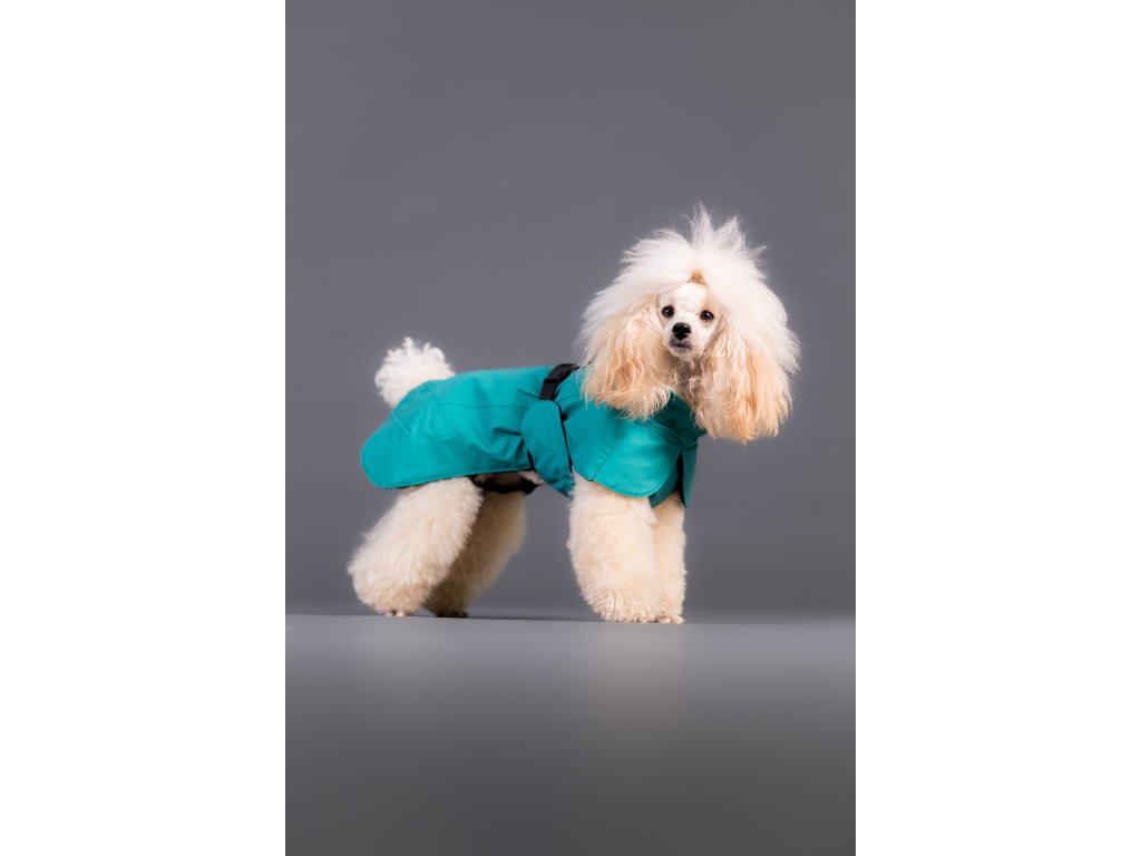 Vodeodolný materiál s podlepenými hlavnými švami. Vetruodolná vonkajšia vrstva, hrejivá výplň. Nastaviteľný golier, pás, dĺžka chrbta a popruhy na nohy. Otvor na postroj. Snehový pás na brušnej časti.