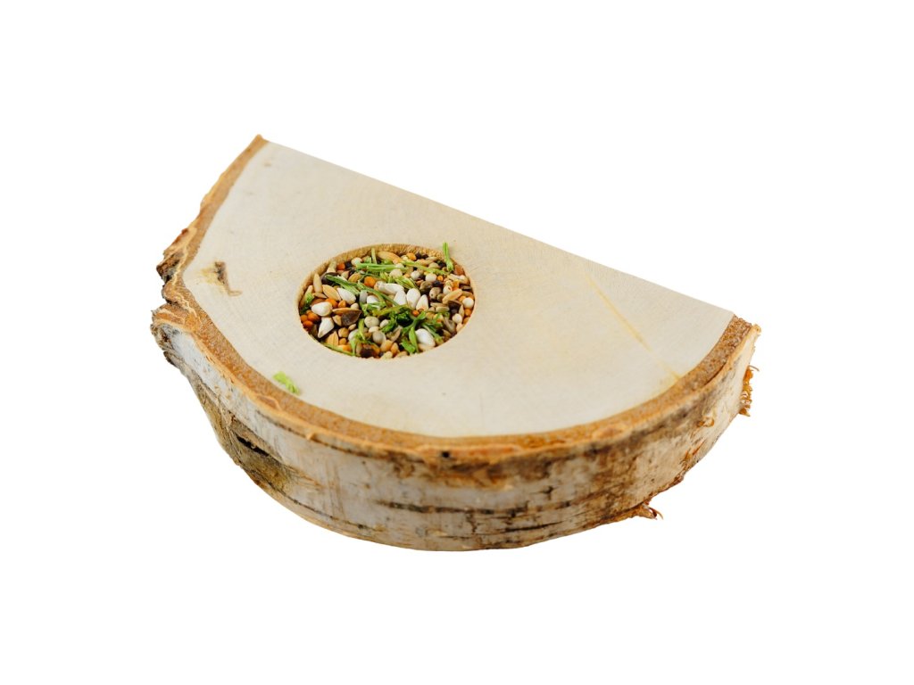 Brezová pologuľa s vyvŕtaným otvorom je prirodzenou miskou pre vášho hlodavca. Je plnená rôznymi semienkami a sušenou petržlenovou vňaťou.